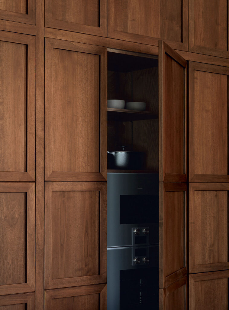 Le lambris Atlante, réalisé artisanalement sur toute la hauteur, accueille des espaces de rangement et des appareils électroménagers, habillant l’espace d’une présence chaleureuse et rigoureuse. Dans le dialogue entre ces deux éléments, acier et bois s’exaltent mutuellement, définissant un environnement cuisine essentiel, sophistiqué et intemporel.