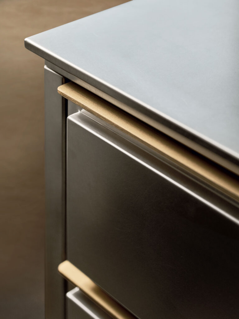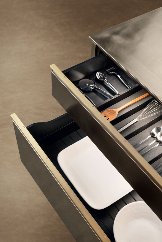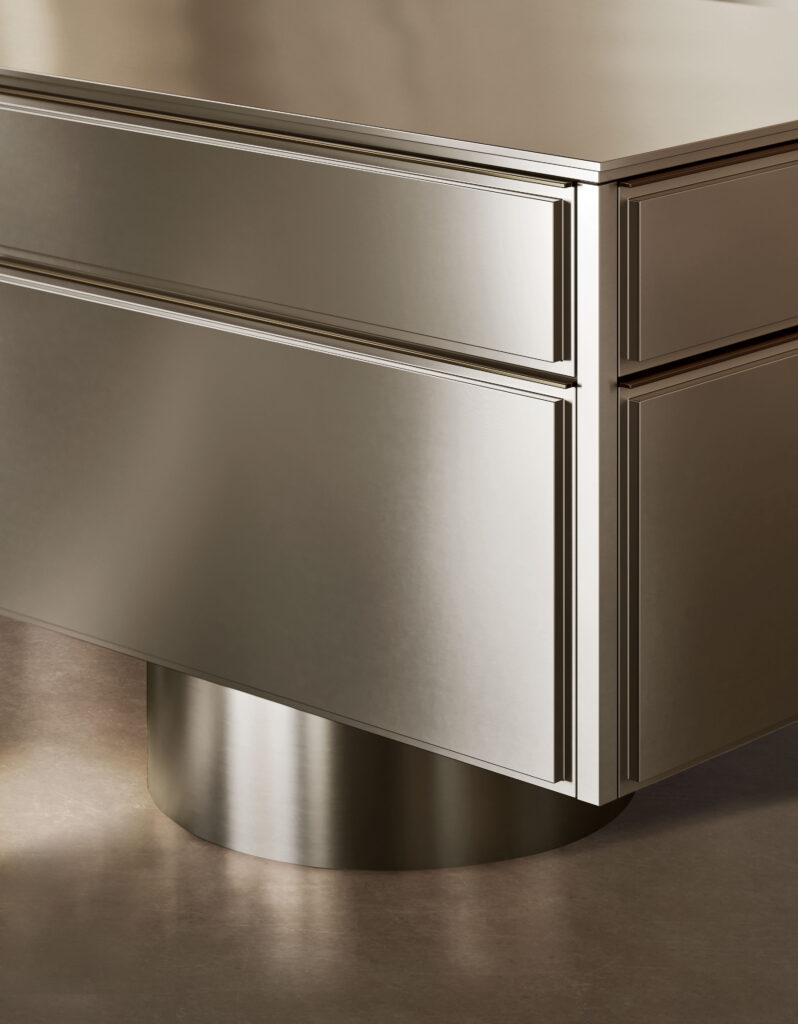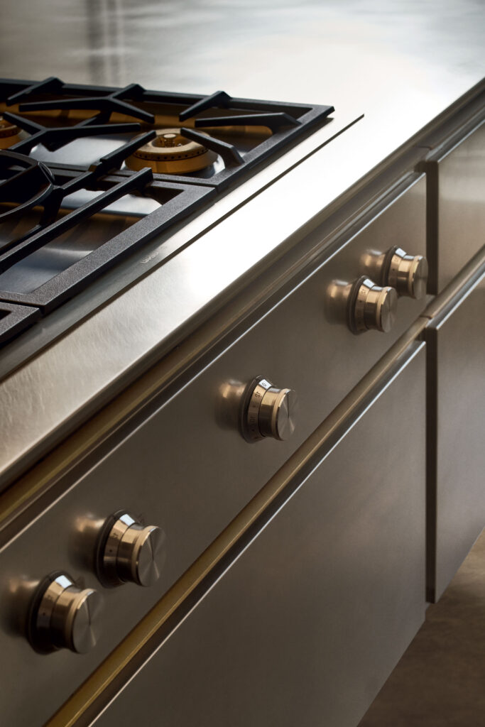 La porte lisse encadrée en acier, à l’effet tridimensionnel, se distingue par son profil en laiton qui met en valeur ses formes, tout en se transformant en une poignée fonctionnelle et discrète. La cuisine Virtus se complète ainsi avec des îlots centraux à la fois opérationnels et conviviaux, introduisant un équilibre entre rigueur esthétique et praticité.